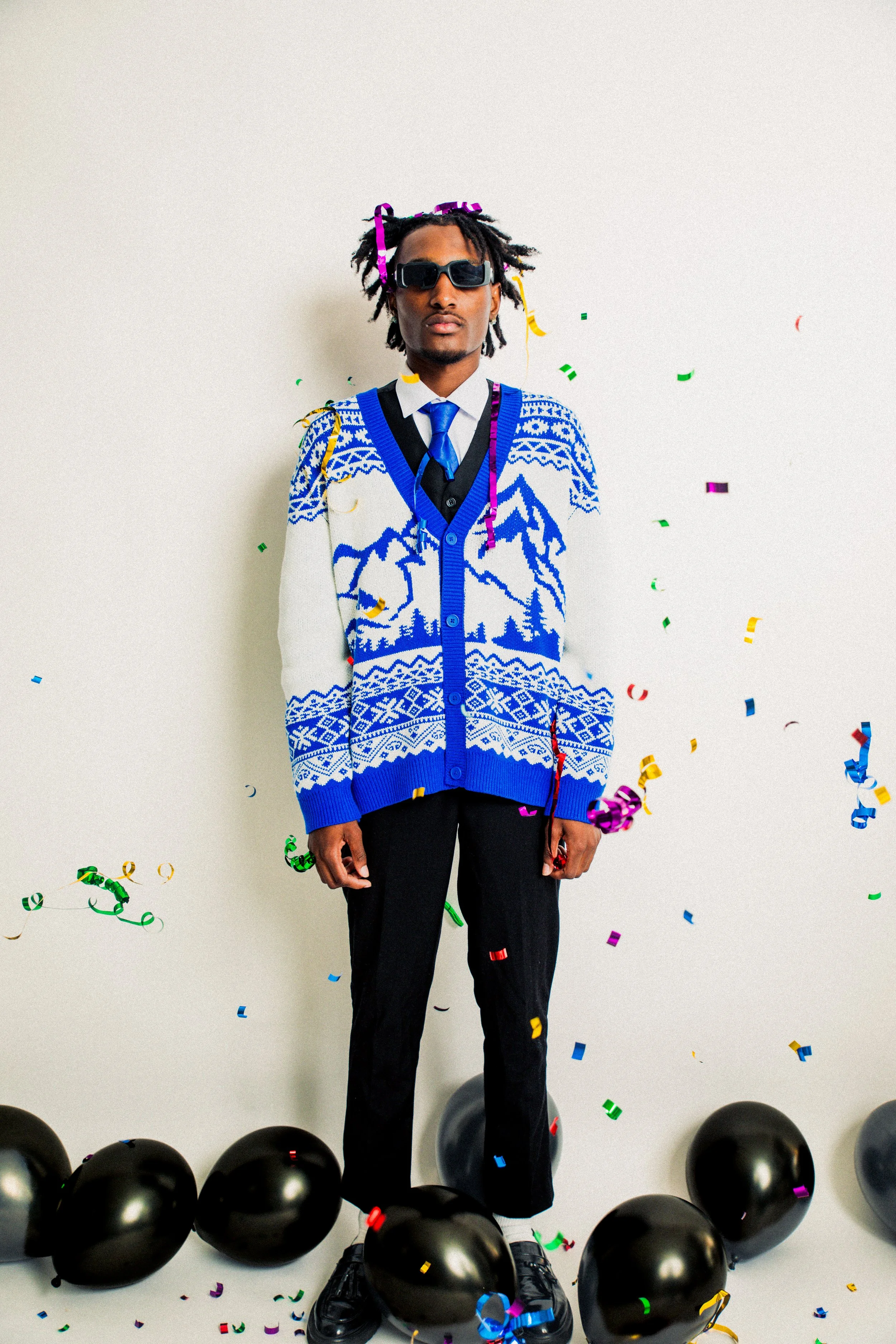 A young man standing in front of a plain wall, wearing sunglasses, a patterned Christmas sweater, black pants, and black shoes. Colorful confetti is falling around him, and black balloons are on the floor at his feet.